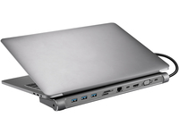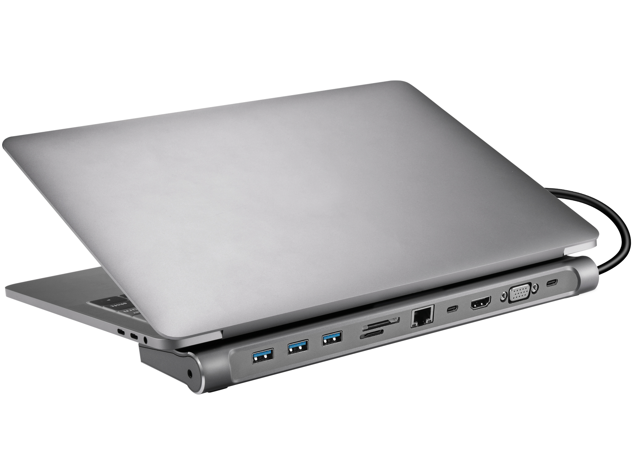 • Power connector for full strength USB-C power supply up to 100WThe docking station is stylishly designed in aluminium and can be used as a practical table stand under your laptop.