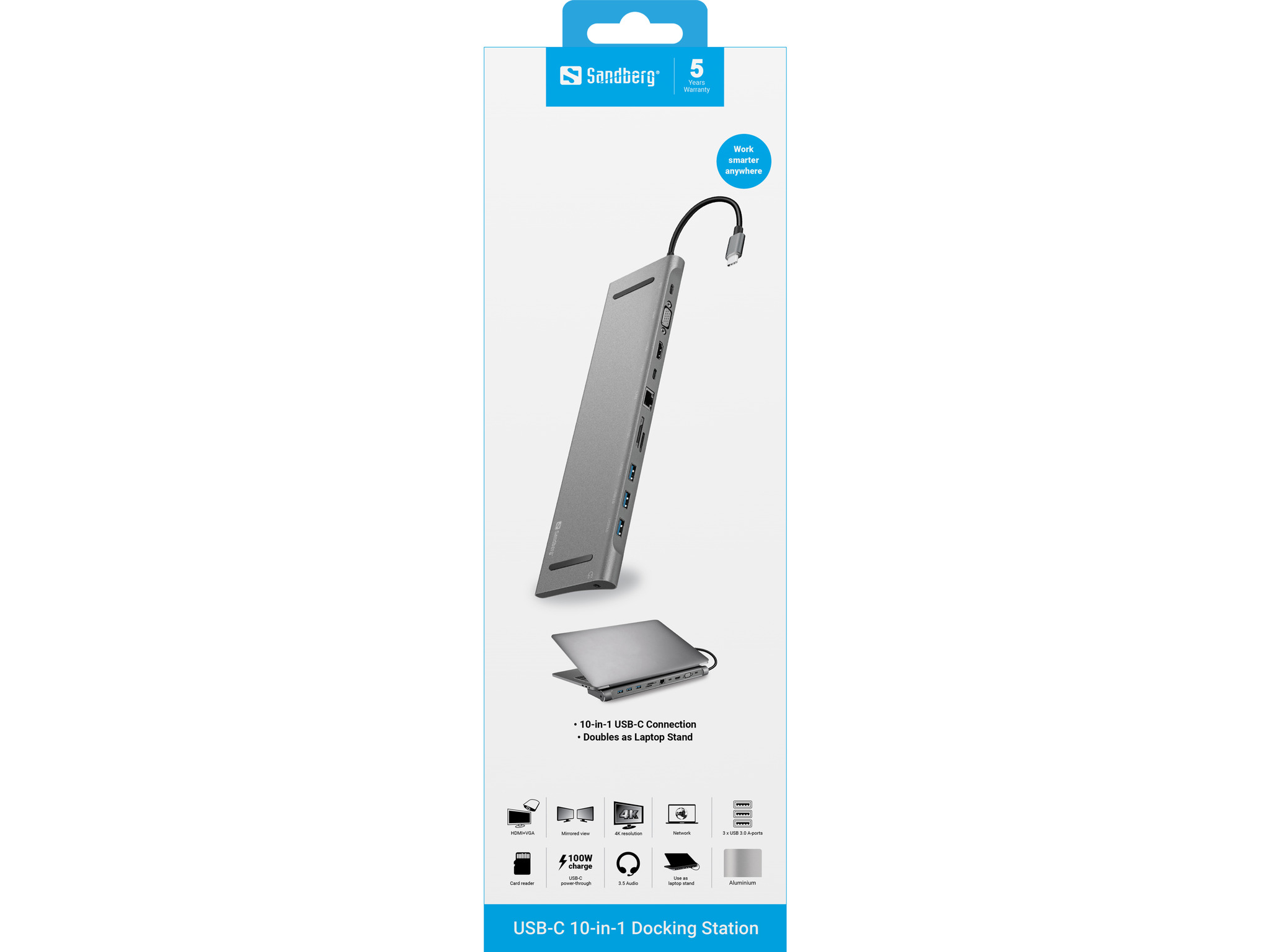 With just one USB-C connection to your laptop Sandberg USB-C 10-in-1 Docking Station gives you the possibility of connecting all your gear: