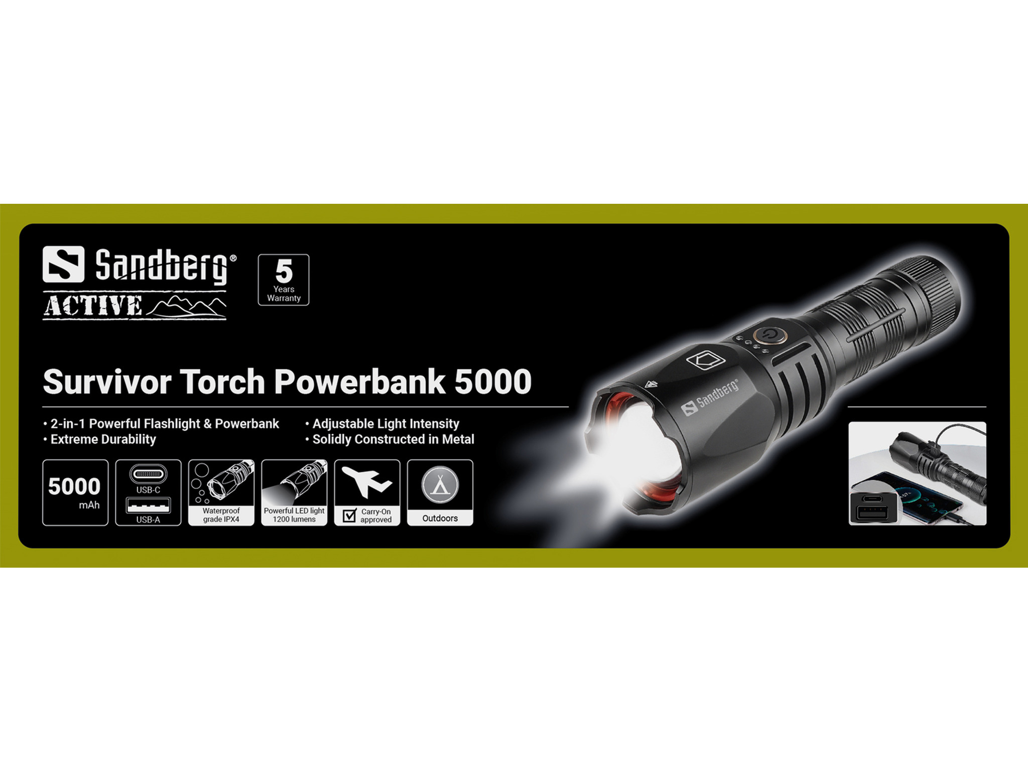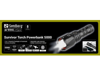 Sandberg Survivor Torch Powerbank 5000 is the perfect gear for adventure, expeditions and camping – and could save your life in an emergency. The strong, built-in battery ensures a long-lasting strong light and the possibility of hazard flashers for many hours. On the side of the torch there is a USB port allowing you to charge your smart phone. Highly robust design that will make it last in rough conditions. You can adjust the light cone as necessary. Additionally, the torch can be used as an emergency hammer.