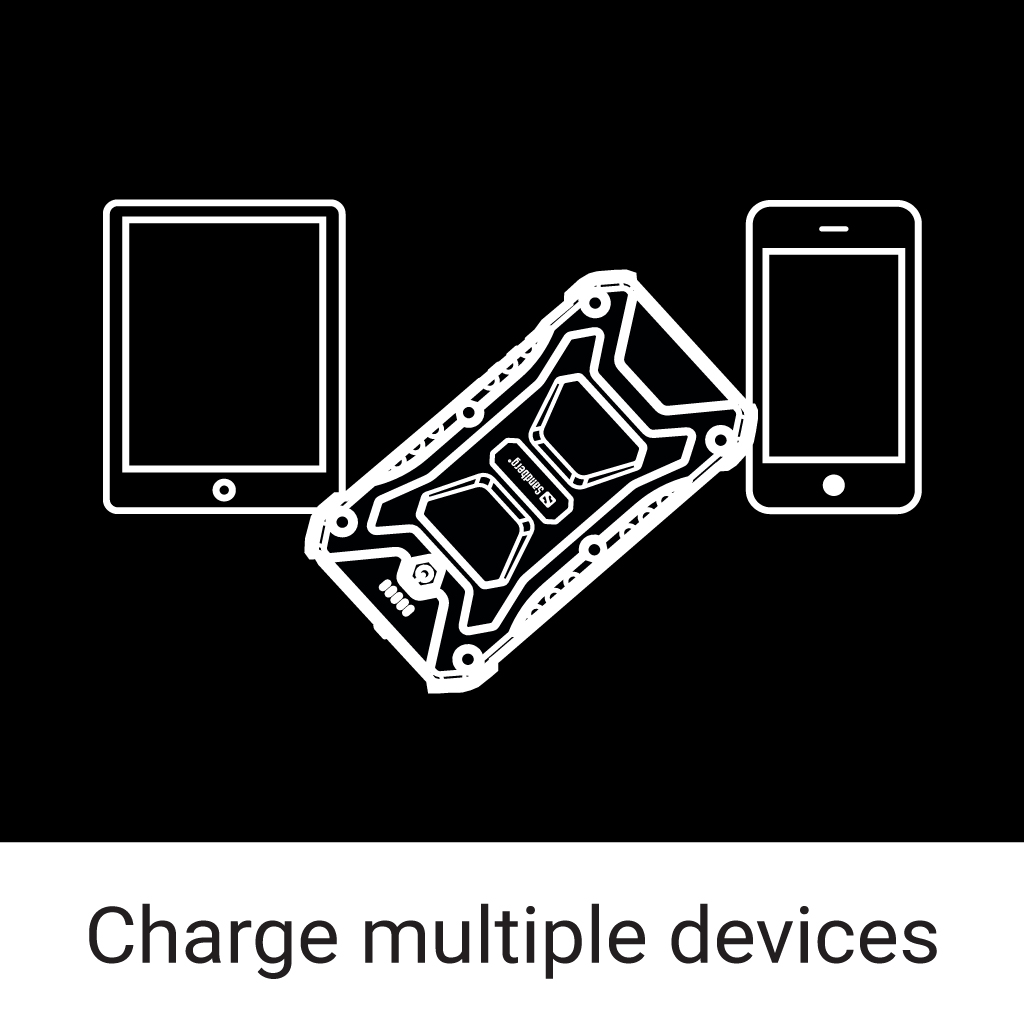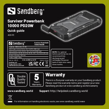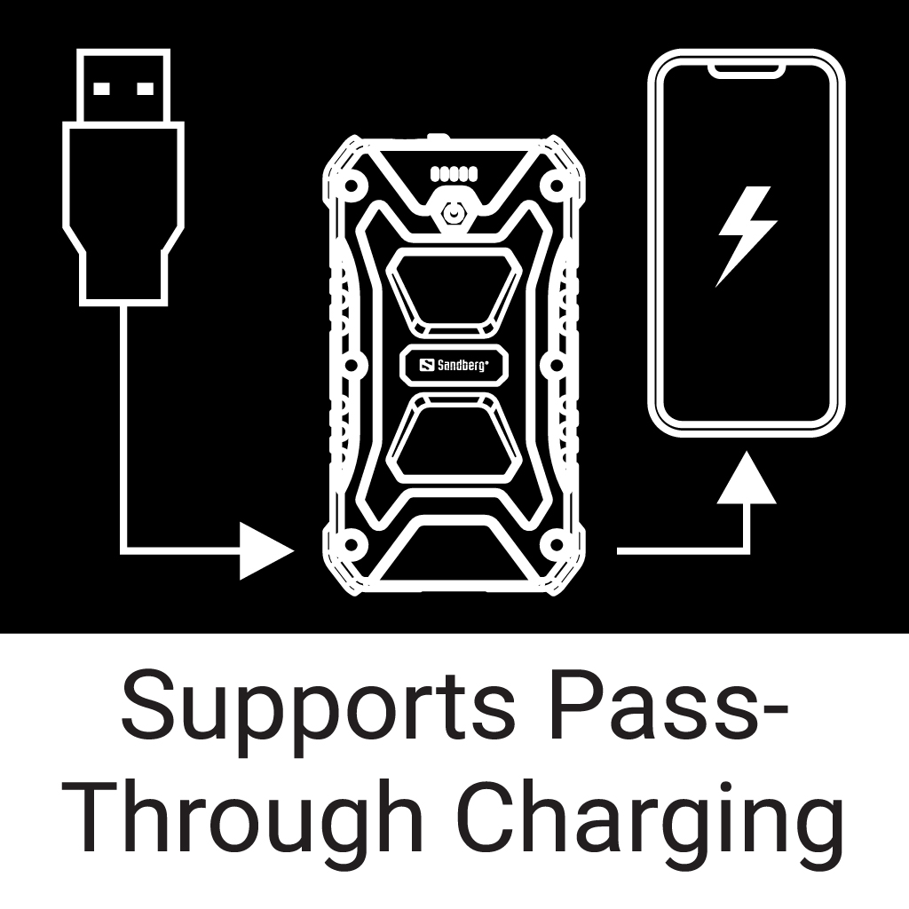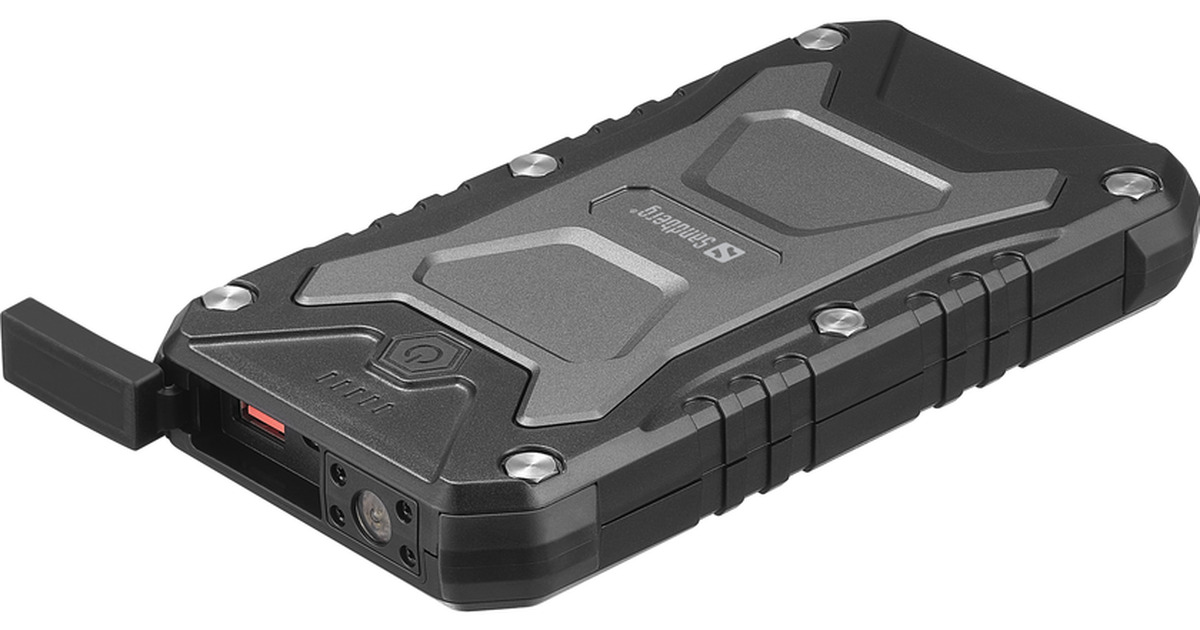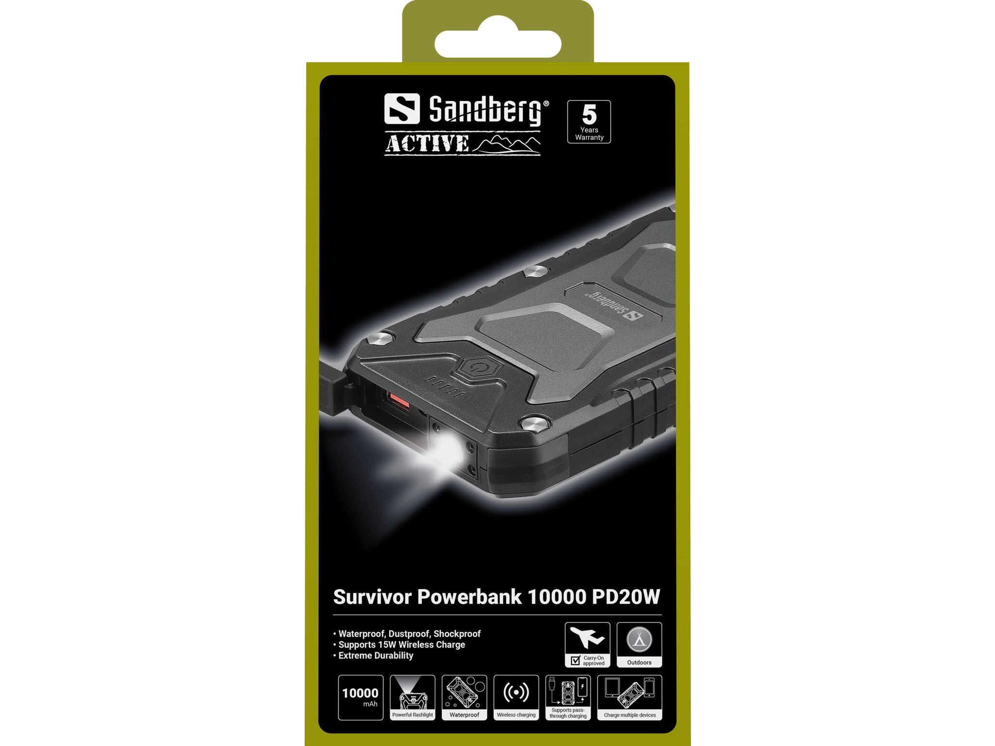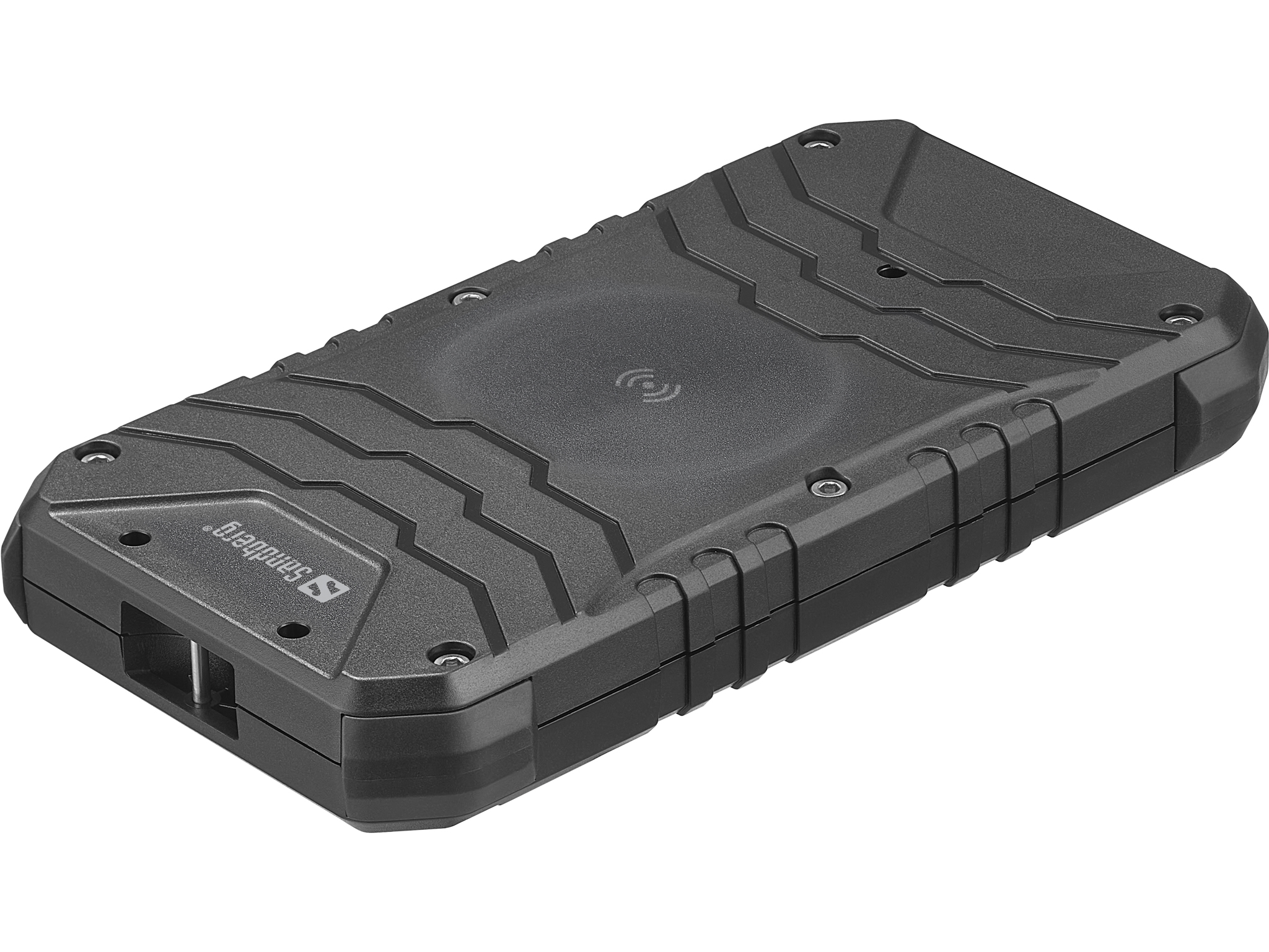 With the Sandberg Survivor Power Bank 10000 PD20W in your luggage, you won't run out of power on your phone or other portable devices when you're far away from a socket. You get up to 4 charging cycles for a typical smartphone and with its solid and waterproof exterior it keeps going even under harsh conditions. Charging status can be read easily using the LED lamps on the top. Qi-compatible smartphones can be charged completely wirelessly by placing the phone on the charging plate on the powerbank.