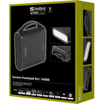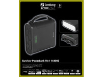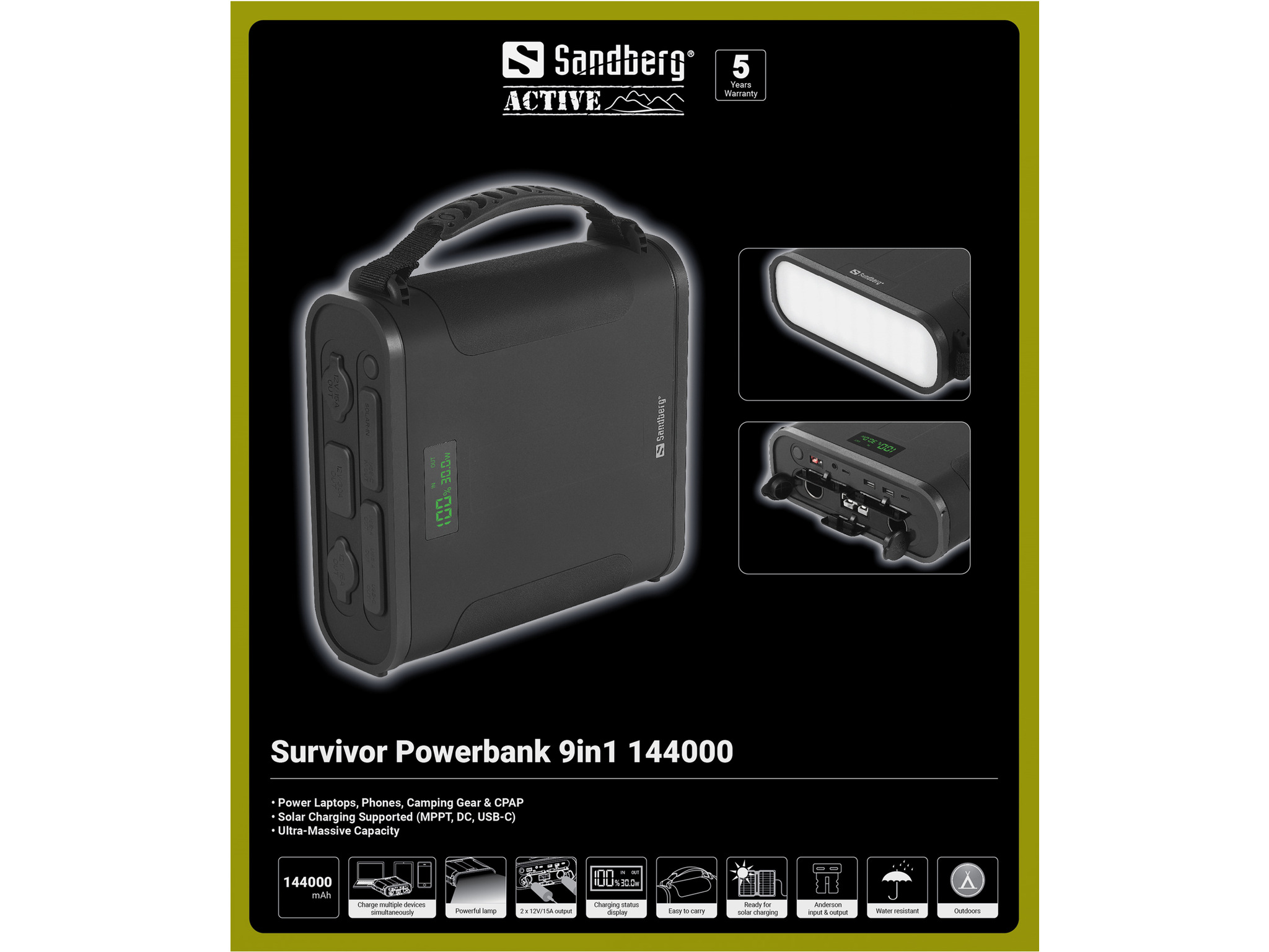 Sandberg Survivor Powerbank 9in1 144000 is the ultimate portable power station for both adventurers and professionals in the field. The enormous 144,000 mAh battery provides enough energy to keep smartphones, tablets, and laptops running for days – and can even deliver stable power to equipment such as CPAP machines, lights, and coolers.The powerbank features a total of 9 ports for a wide range of charging options:1 × USB-C port for charging USB-C devices such as laptops, tablets, and smartphones. Can also be used as an input for charging via wall charger or solar panel.1 × additional USB-C port for fast charging of smaller devices.2 × USB-A ports for charging phones, cameras, and other equipment.2 × 12 V DC ports for devices such as lights, pumps, or CPAP machines.1 × heavy-duty 12V Anderson port for camping gear, coolers, and other high-power equipment.1 × Anderson input for solar panel connection.1 × DC input for charging via wall charger or solar panel.It also includes a powerful integrated LED light with both white and red modes – perfect for emergencies, night work, or camping.Built in water-resistant materials, the powerbank features a clear digital display and a solid carry handle. Charge it from a wall outlet or solar panel, and you’ll have reliable power for all your devices, wherever you are.