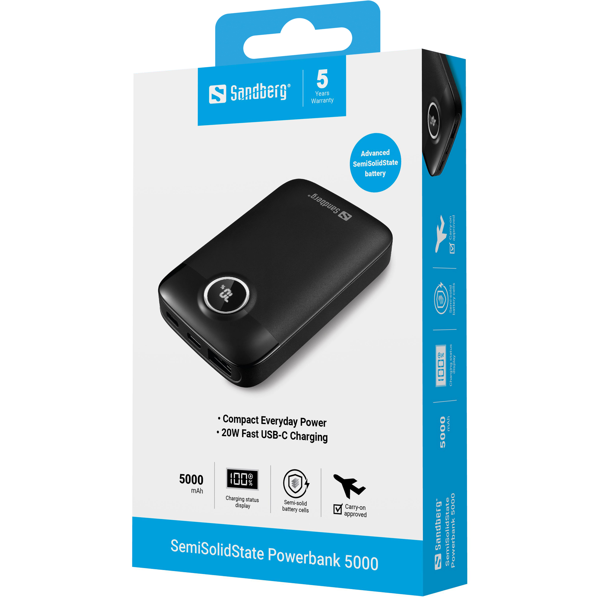 Sandberg SemiSolidState Powerbank 5000 is a compact powerbank with advanced semi-solid battery cells, offering higher safety and stable performance. Perfect for daily use when you need extra power for your smartphone or other USB devices. With up to 20W USB-C charging, you get efficient power in a small and lightweight form factor. The display shows the exact battery level, so you always have an overview. Ideal for your pocket or bag, where size and weight matter.