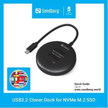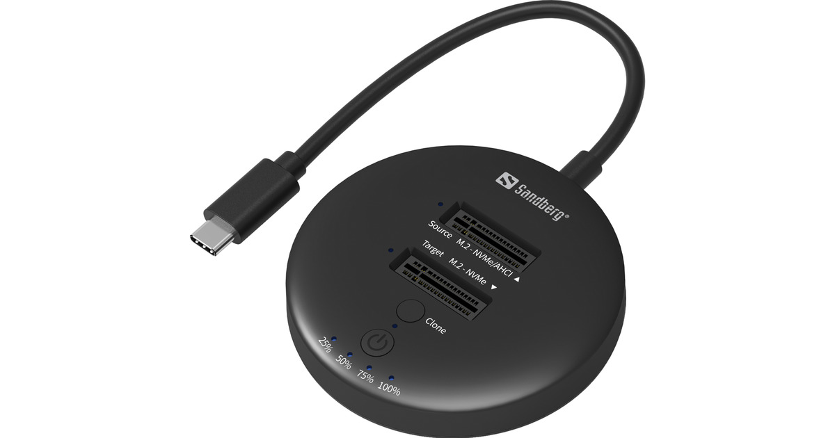 Sandberg USB3.2 Cloner Dock for NVMe M.2 SSD makes it easy to read, write, and clone your NVMe SSDs. Cloning from one disk to another can be done entirely without connecting to a PC. The dock also works perfectly as a disk expansion, allowing you to have two extra SSDs connected to your computer simultaneously. Ideal for backup, data transfer, and storage expansion. Supports up to 20 Gbps via USB-C and requires no tools or software installation.