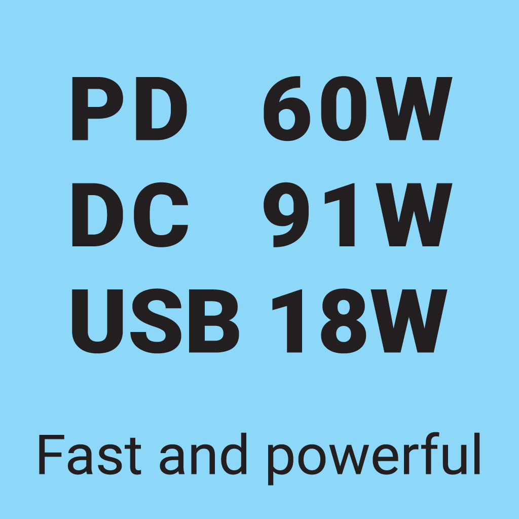 • DC-port output: 12V/6.7A, 15V/4A, 19V/3.8A, 24V/3.8A (91W Max)