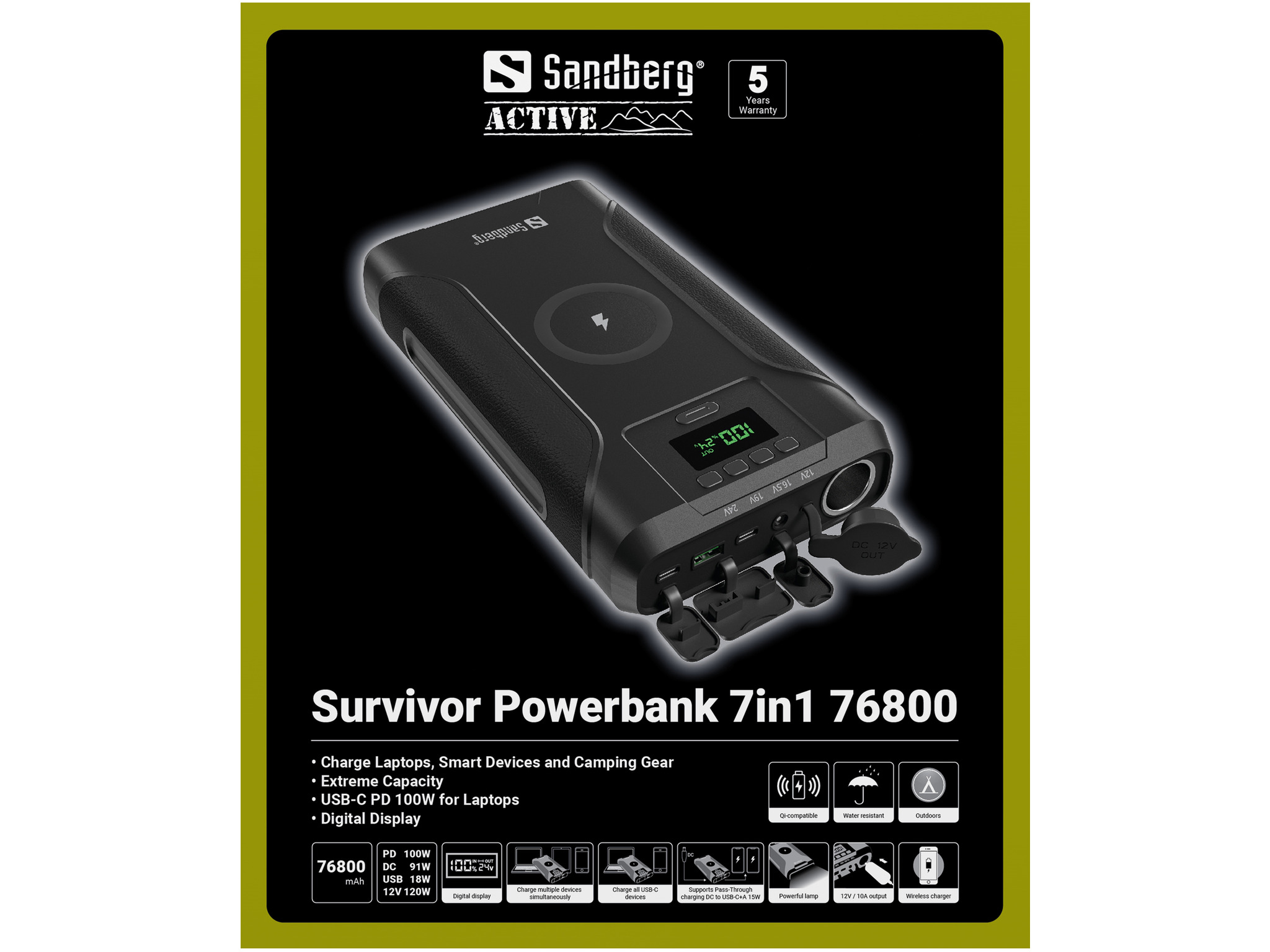 Sandberg Survivor Powerbank 7in1 76800 is the ultimate transportable charging station for just about all your gadgets. The enormous capacity 76800 mAh battery is more than enough to charge your smartphone every day for almost a month. It comes with a wealth of outputs for a range of charging purposes: