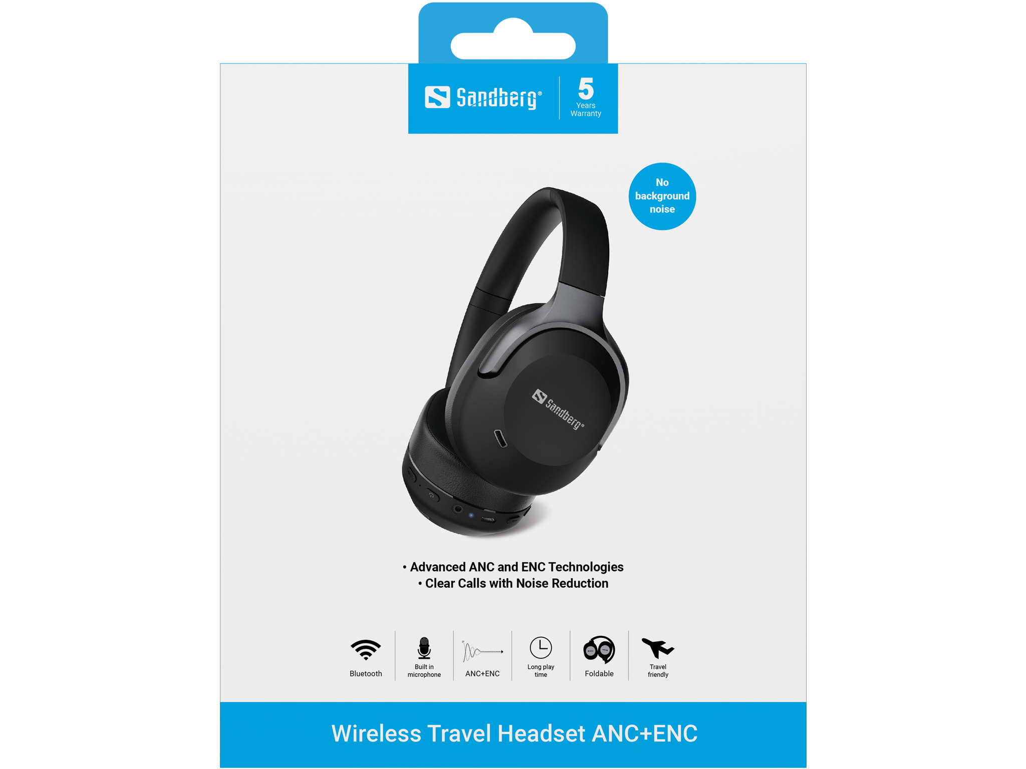 Sandberg Wireless Travel Headset ANC+ENC delivers an outstanding audio experience with advanced ANC and ENC, ensuring uninterrupted listening and clear calls. ENC technology reduces background noise, so your voice is heard clearly during calls. With wireless Bluetooth connectivity and a built-in microphone, it's perfect for both music and calls. The comfortable ear cups make it ideal for long listening sessions. The headset can be folded for easy transport, and USB charging makes it quick and easy to recharge.