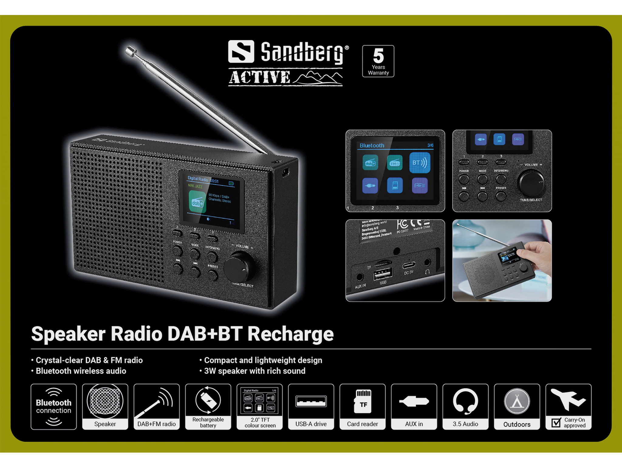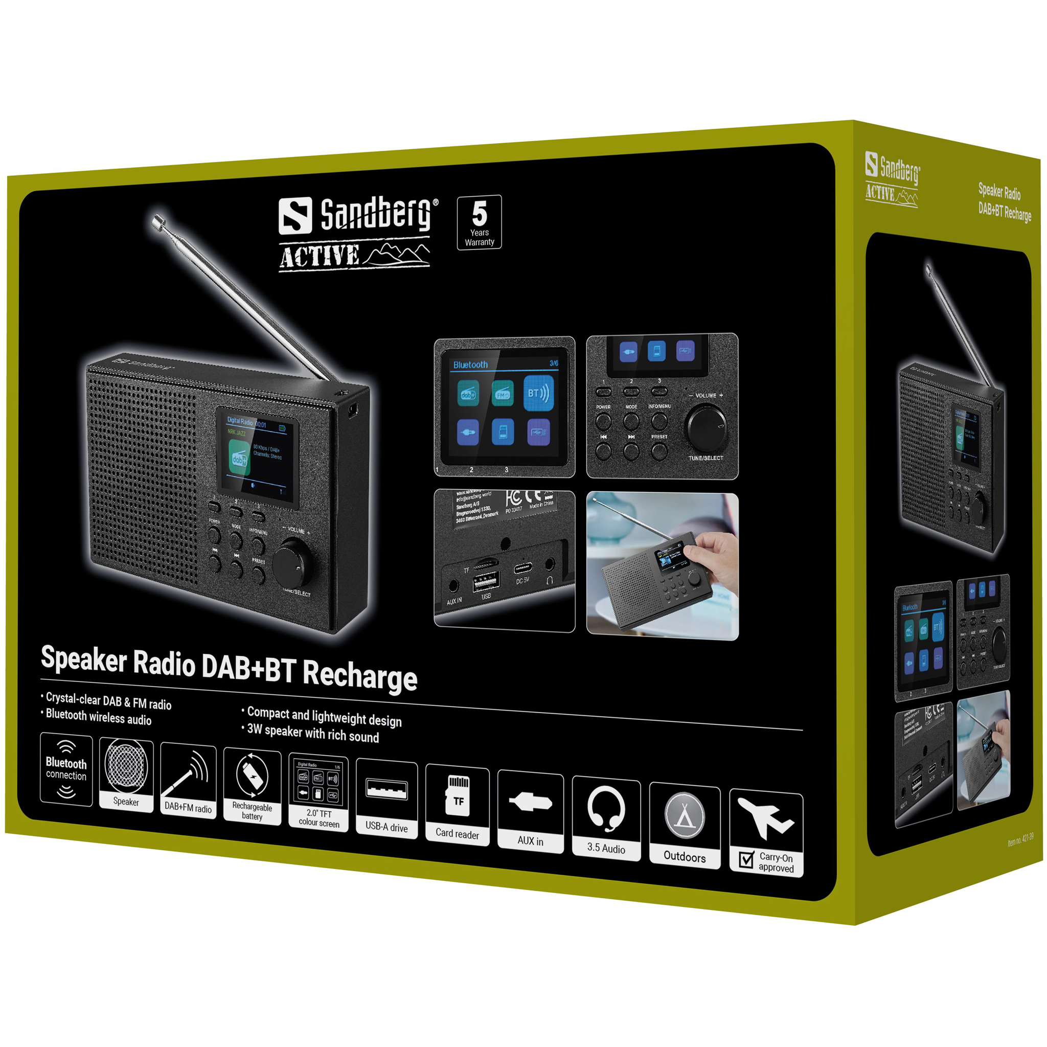 Sandberg Speaker Radio DAB+BT Recharge gives you crystal-clear DAB+ and FM reception, keeping news, music and entertainment right at your fingertips. The TFT colour display makes it easy to switch stations and control all functions. Use it at home, at work, in the kitchen or on holiday – the rechargeable battery gives you the freedom to bring the radio anywhere. You can also stream music via Bluetooth, USB or TF card.