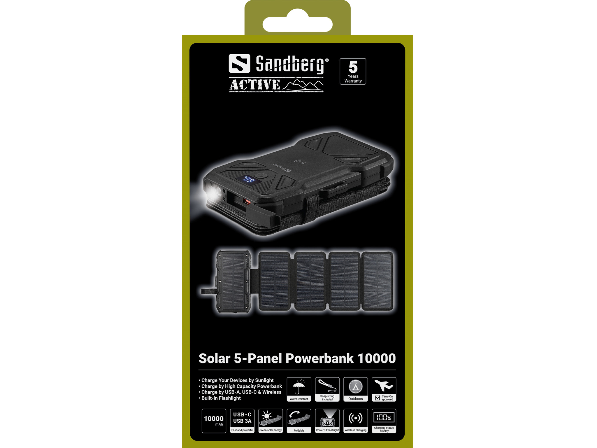 Solar 5-Panel Powerbank 10000 is een combinatie van een krachtige 10000 mAh powerbank en een opvouwbaar zonnepaneel, waarmee je de powerbank snel en efficiënt kunt opladen in zonlicht. Laad de powerbank thuis op en leg hem in de zon wanneer je maar kunt. Op deze manier heb je altijd stroom voor mobiele apparaten, ongeacht hoe ver je van een stopcontact bent.